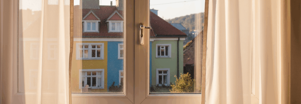 Imagine, you are looking through window in a nice morning. Colorful buildings, pure air. Everything looks nice and fine. Yes, there is a coffee cup in your hand.